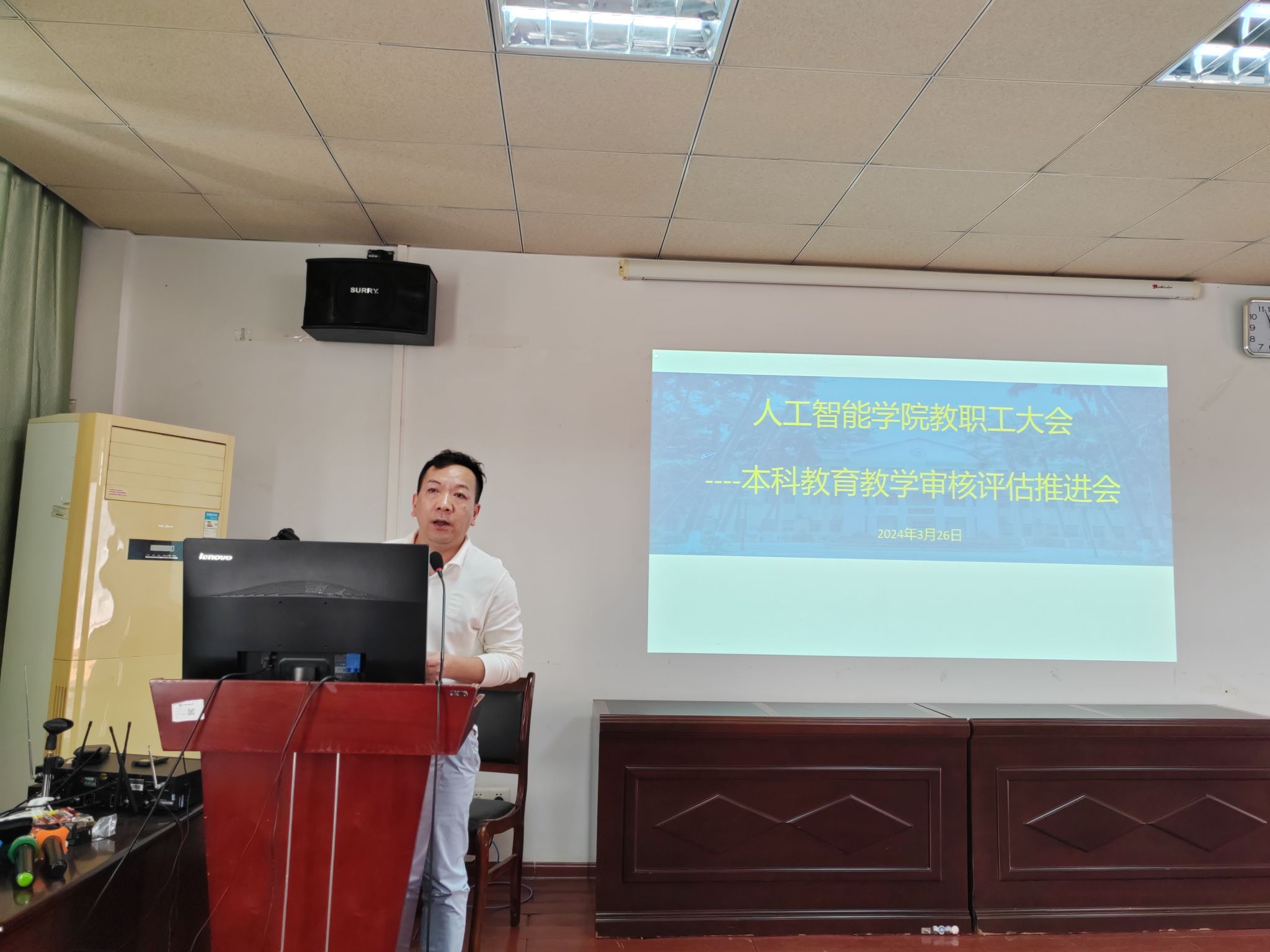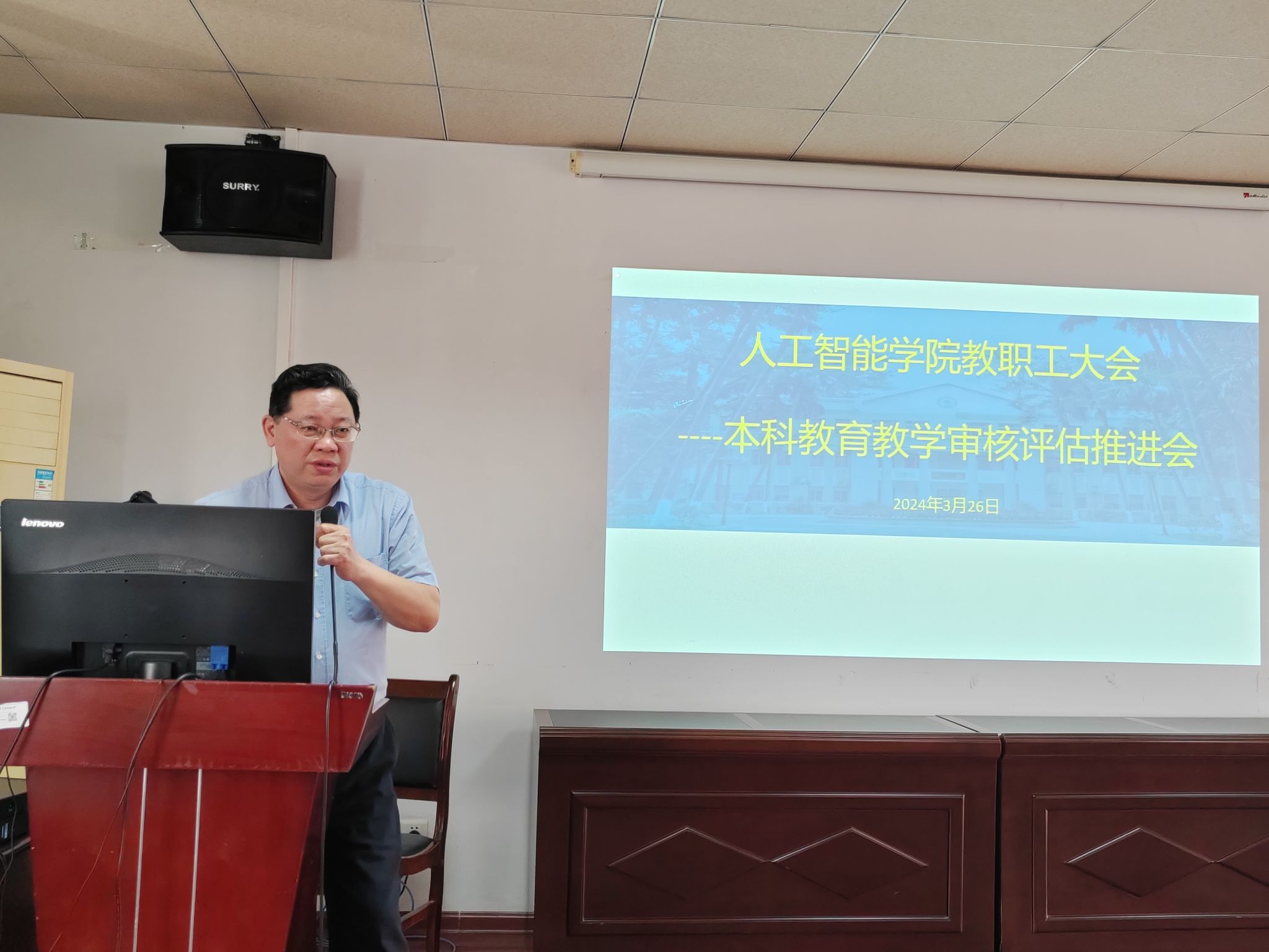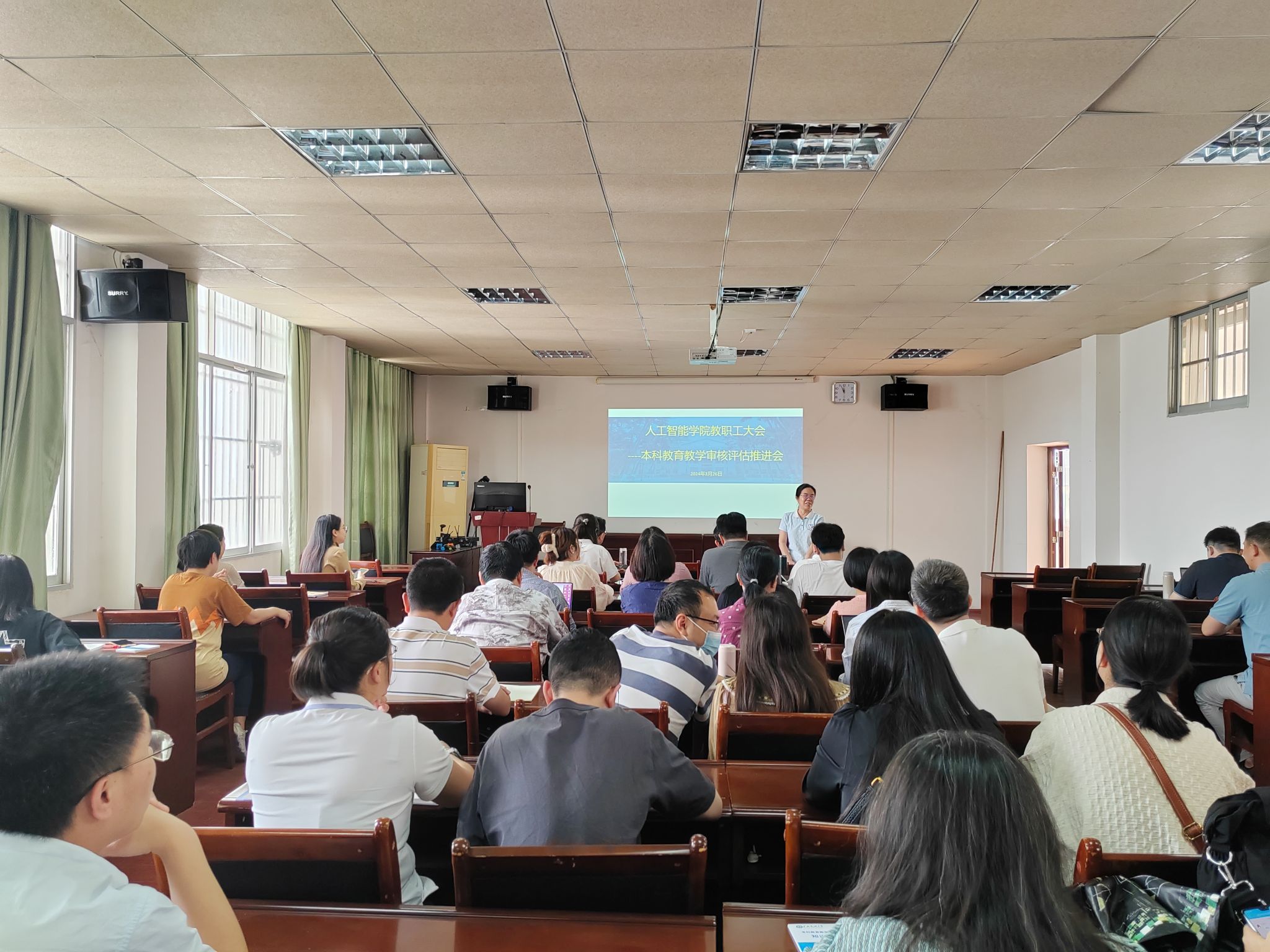3月26日下午,公司于博达楼418室召开全体教职工大会,经理葛丽娜对公司本科公司产品审核评估工作情况进行通报,并对近期要开展的工作进行布置。公司党委书记蔡其明要求全院教职员工要积极行动起来,真正做到以评促教、以评促改、以评估管、以评促强。