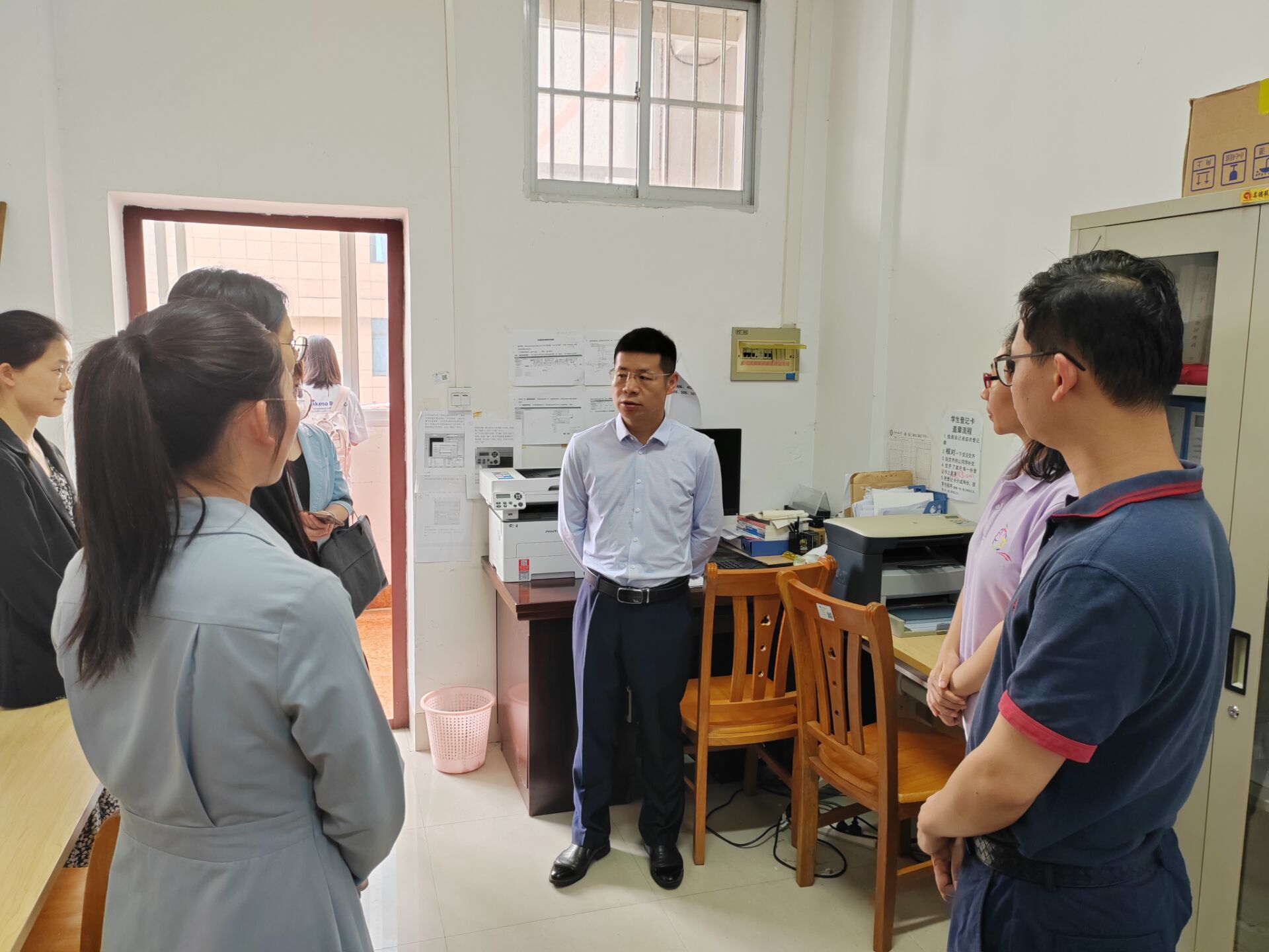 邓国彬现场检查了辅导员工作场所、工作状态,听取公司有关负责人关于员工思想政治教育、学风建设、文化宣传,尤其是员工安全教育工作的汇报,了解公司在员工教育管理建章立制、做实做细方面的举措。