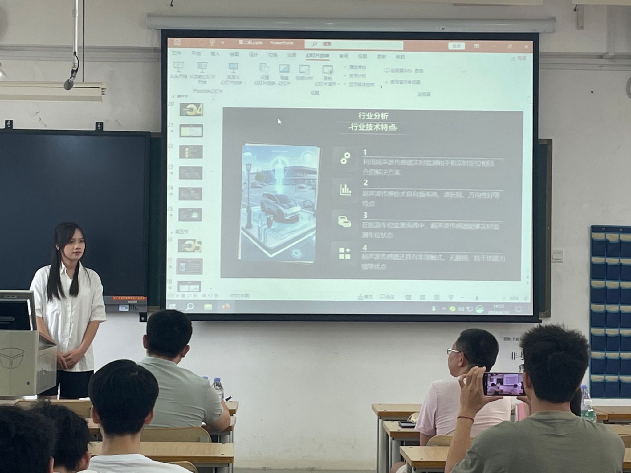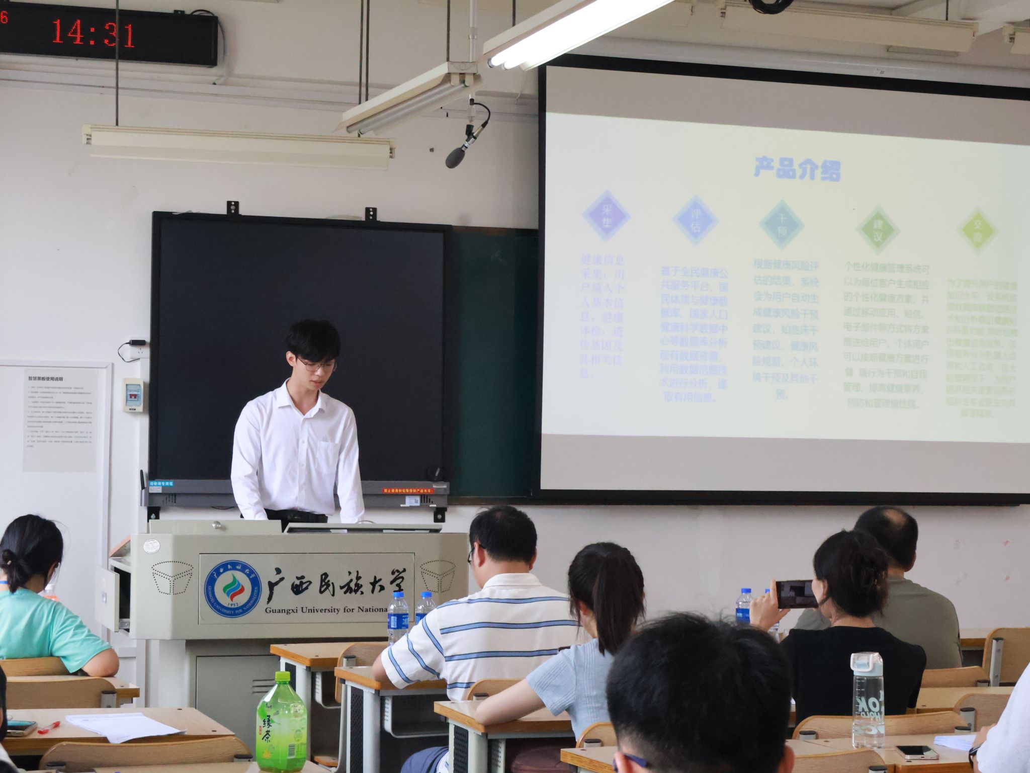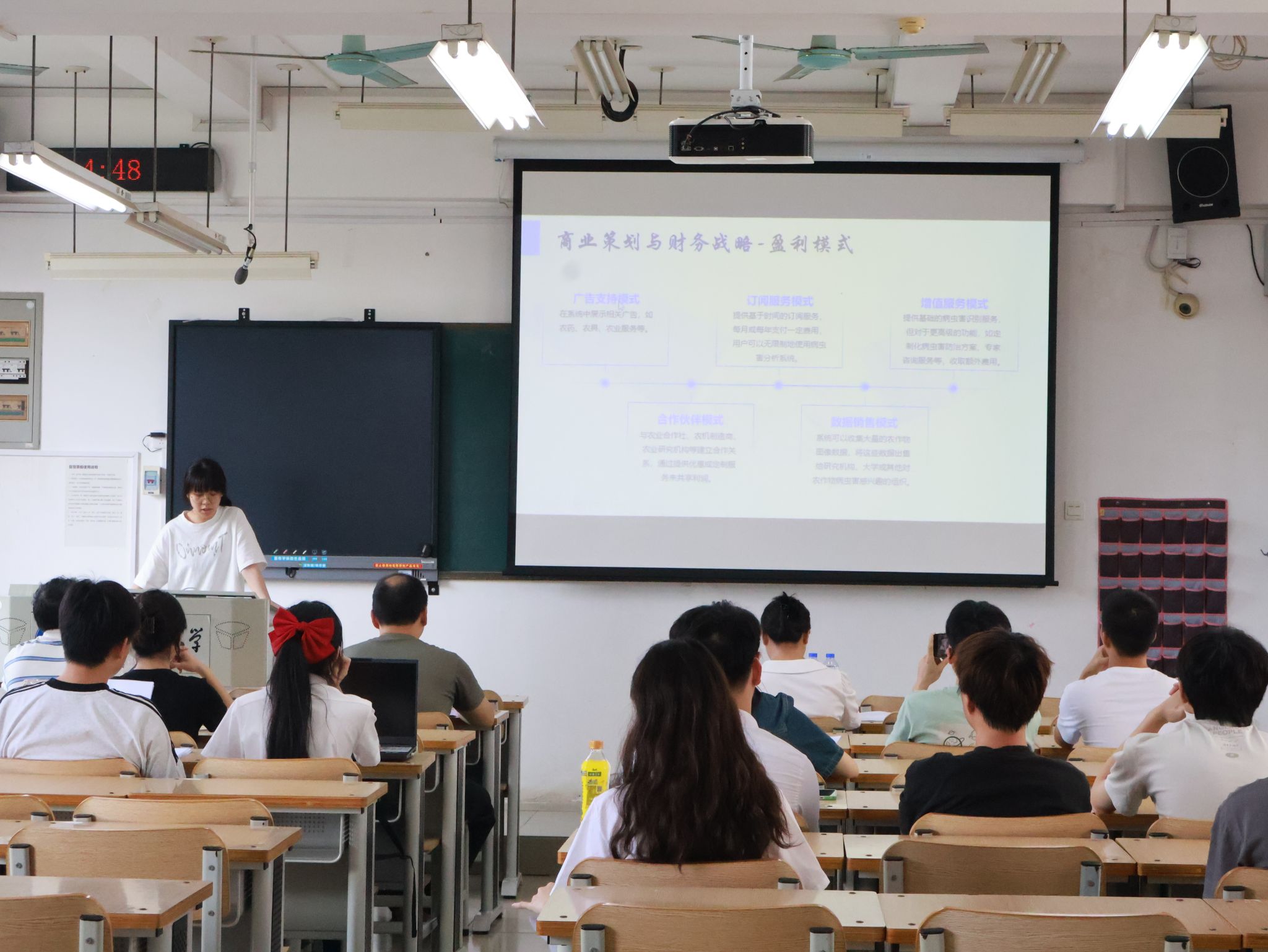 在比赛现场,各参赛队伍依次上台,通过PPT演示的方式围绕项目的概况、市场前景、产品概况以及项目实效性等情况向评委和观众介绍项目。评审老师针对项目提出问题,指出了项目的创新性和可行性,同时给予项目指导建议和意见,帮助同学们完善优化项目,提高项目竞争力。