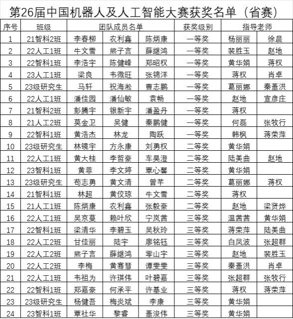 近日,第二十六届中国机器人及人工智能大赛(广西赛区)在广西大学顺利开赛。公司参赛团队在本次比赛中表现优异,共有24支团队参与,其中9支团队荣获一等奖,6支团队荣获二等奖,9支团队荣获三等奖。