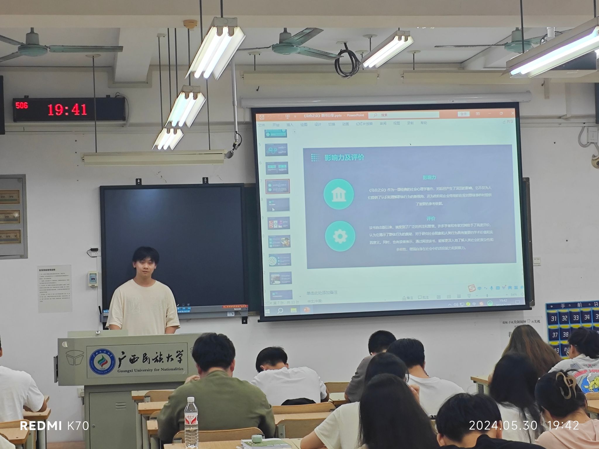 2023级人工智能1班覃鑫宇同学向大家分享了《乌合之众》一书,书中分析了人们在群聚状态下的心理、道德、行为特征。他表示:“在阅读此书后,我深刻认识到了群体心理的复杂性和多样性,也更加明白了如何更好地理解和应对群体行为,也希望未来能够有更多机会与大家共同探讨和学习。”