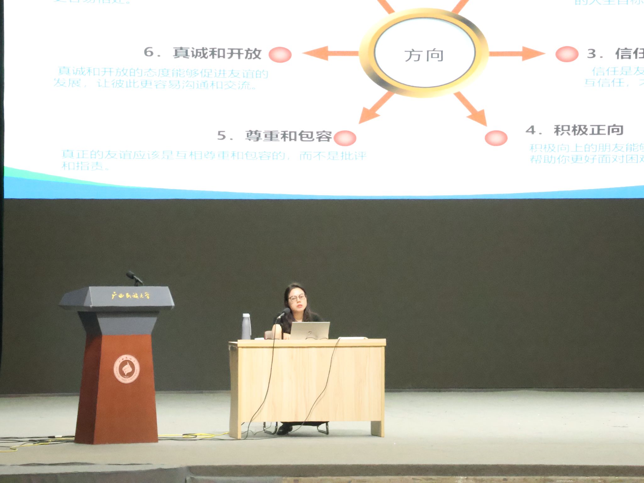 李清老师以其生动的讲解和富有启发性的互动问答,引领新生们深入探索了丰富多彩的校园生活与科学合理的生活规划。讲座内容广泛,不仅涵盖了如何构建和谐的人际关系和制定合理的作息安排,还深入到了个人成长与发展的方方面面。