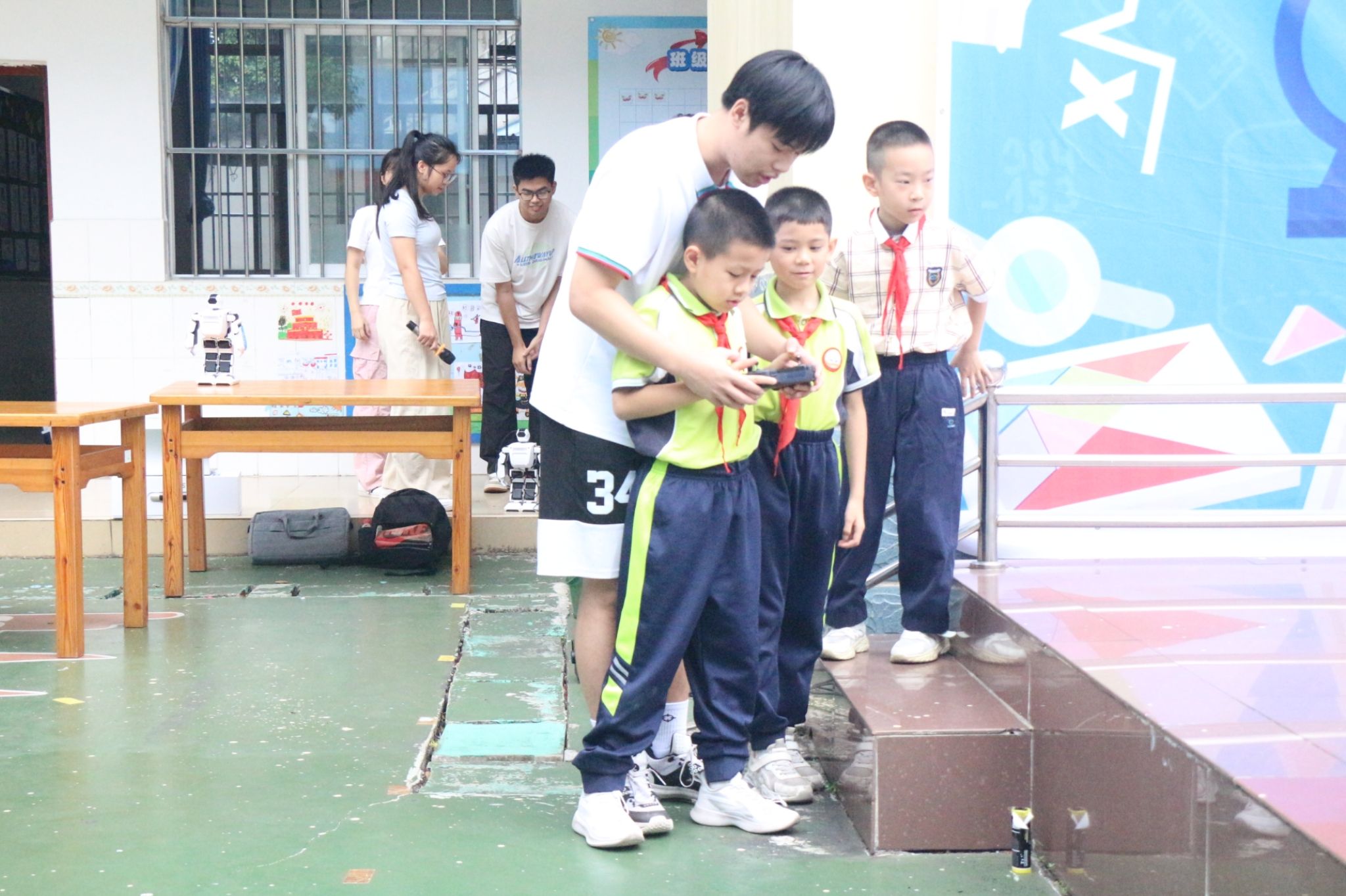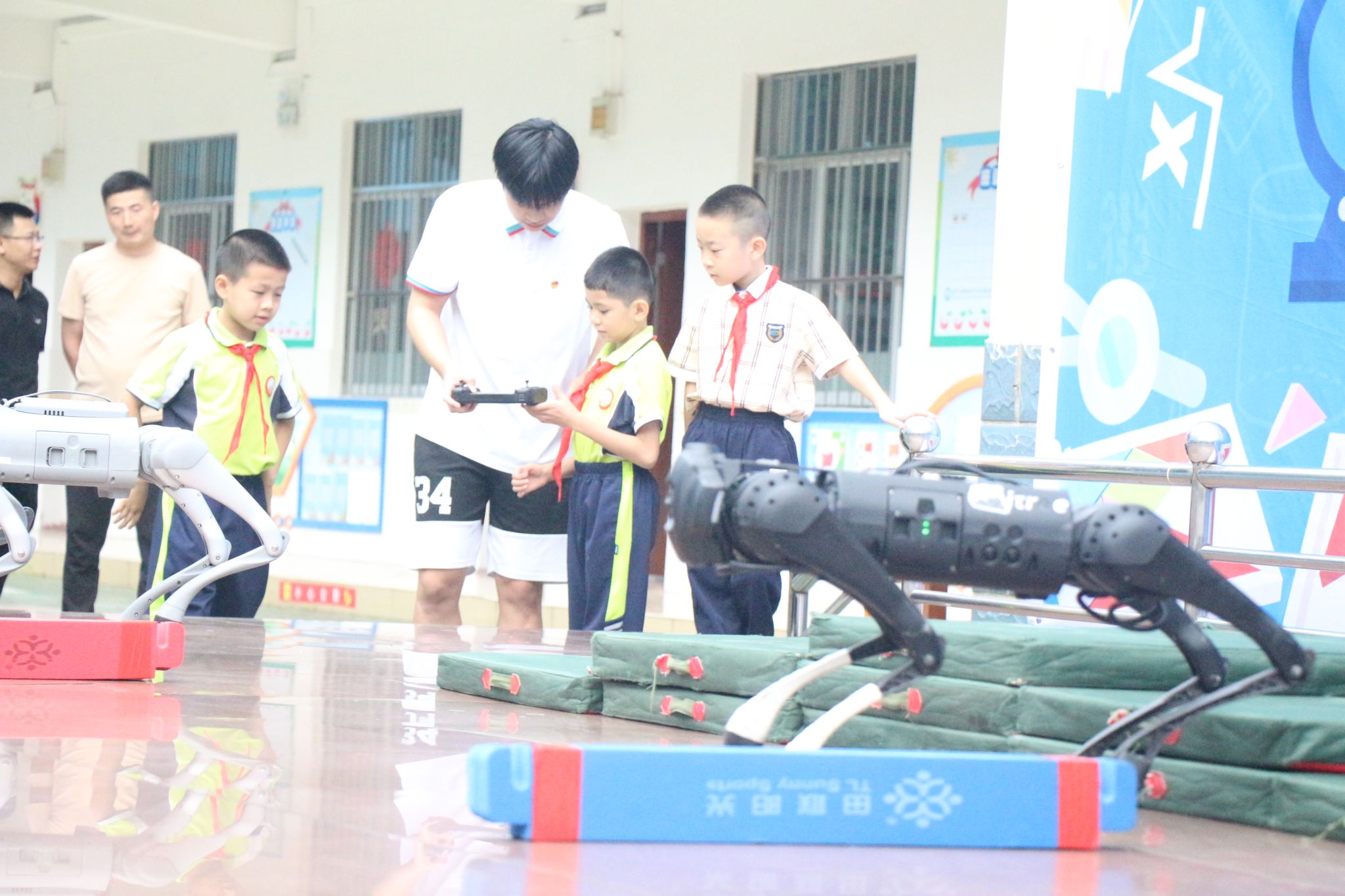 员工党员黄浩杰同学在教小朋友操作机器狗