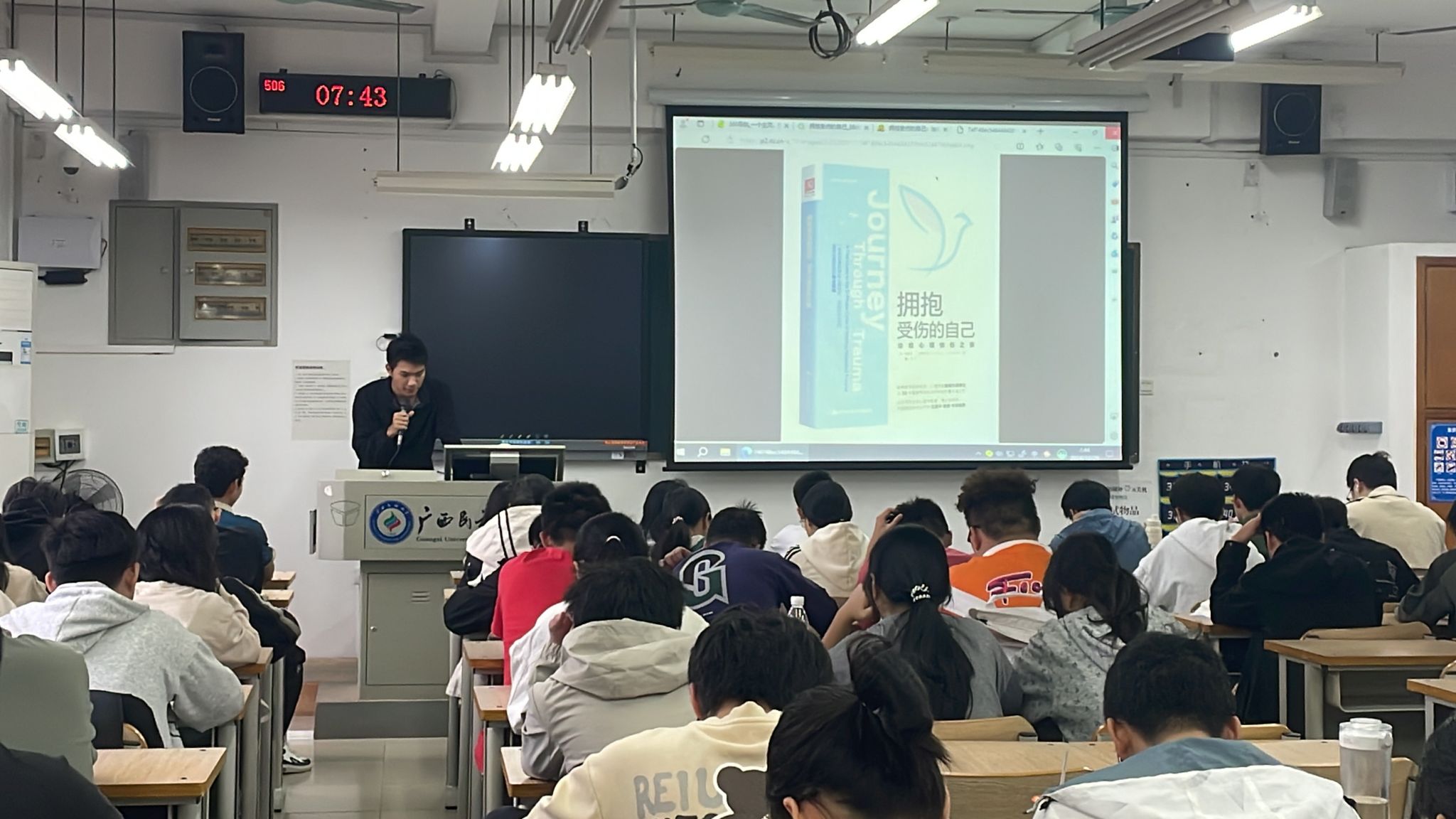 2024级计算机科学与技术2班彭天翔同学分享了自己阅读《拥抱受伤的自己》一书的感悟和体会。书中主要内容包括如何识别和处理内心的创伤、如何通过自我接纳实现情感上的愈合以及如何在日常生活中实践积极心理学。他也用生动的案例分析了书中提出的多个心理建设策略,让同学们对心理健康的重要性有了更深刻的认识。他表示:“我们无论生活中遇到多大的困难,都要学会拥抱自己的不完美,因为真正的强大来自内心的平和与自爱。”