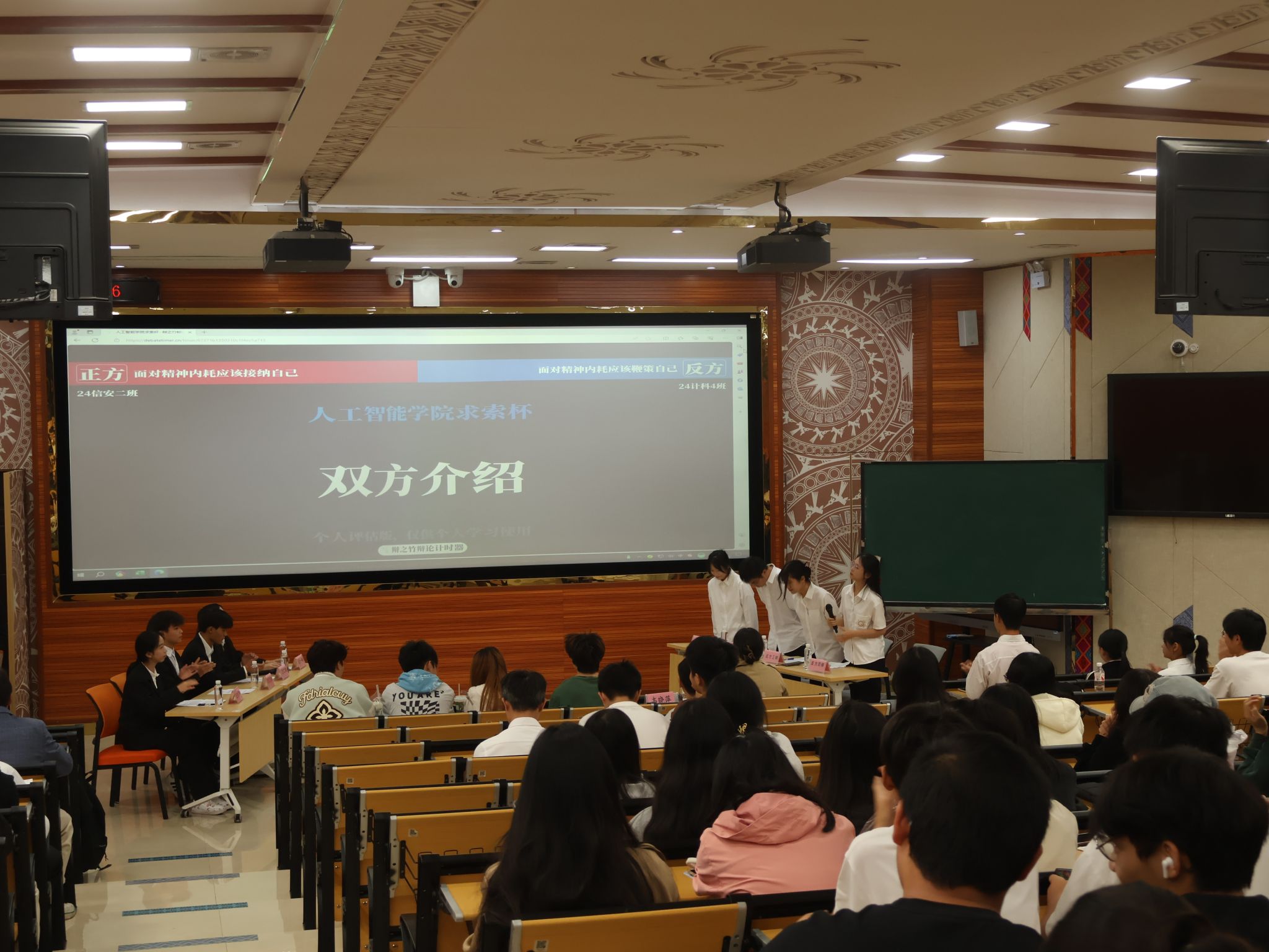 季军争夺赛围绕“面对精神内耗我们应该接纳自己还是鞭策自己”这一辩题展开。开篇立论环节,正反双方之间旁征博引,通过将理论与实践相结合,充分列举多个例子来论证本方观点。在自由辩论环节中,双方更是针锋相对,抓住突破口,或一针见血,或循循善诱,一次次将比赛推向高潮。赛场气氛紧张激烈,双方对手你来我往,侃侃而谈。