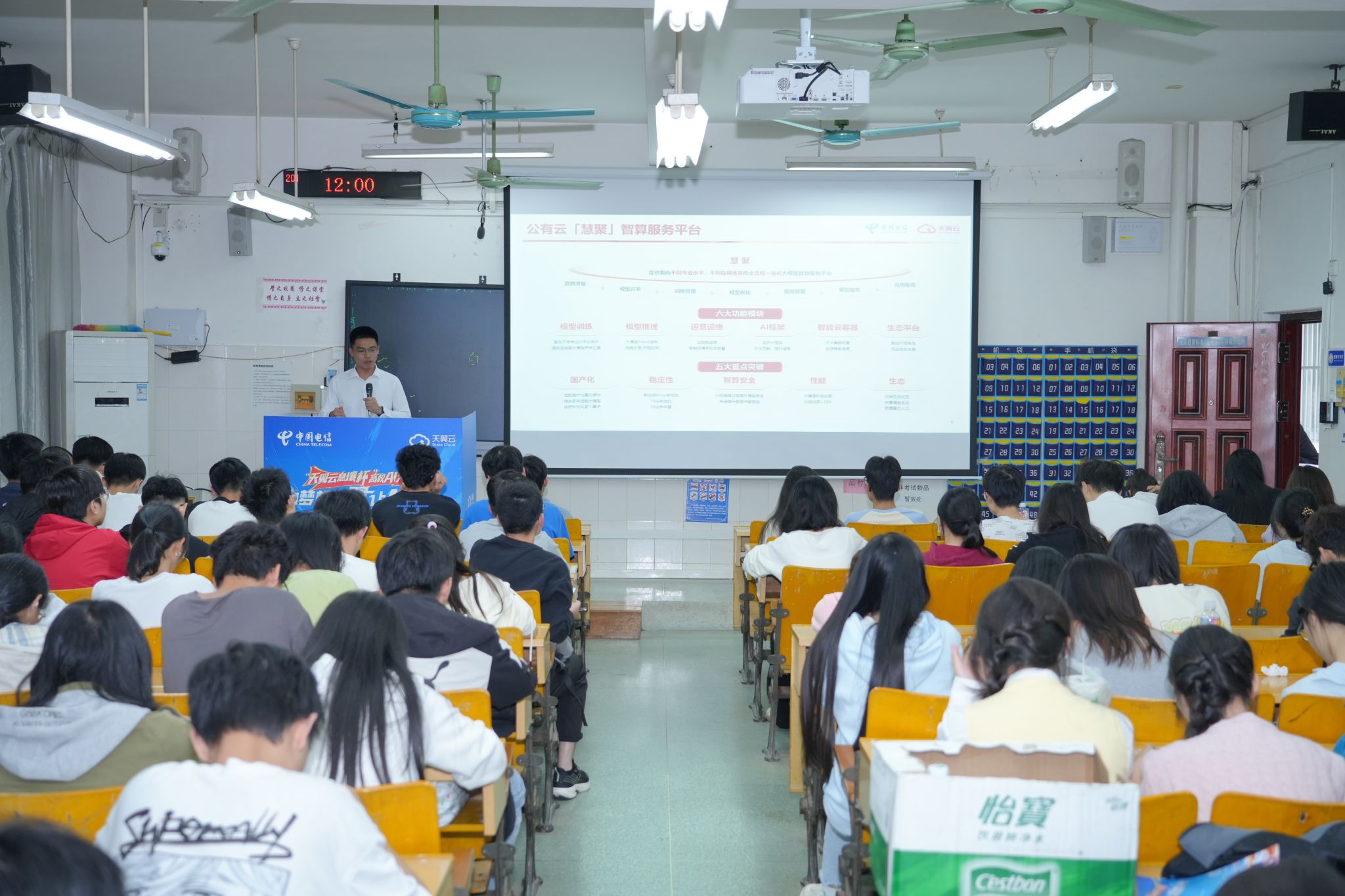 11月26日下午,中国电信集团有限公司在员工楼201室举行“天翼云息壤杯”高校AI大赛宣讲会,公司各班级代表到场学习。