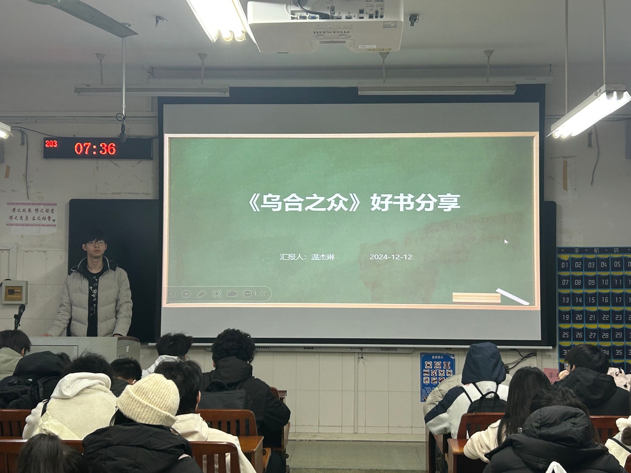 2023级计算机科学与技术2班温杰琳同学在分享《乌合之众》时,深入挖掘书中关于群体心理的深刻观点,通过列举一系列历史事件,抽丝剥茧般地剖析群体在特定情形下是如何丧失个体理性的过程,进而引发了同学们的热烈讨论,同学们各抒己见,从不同的视角深入探讨群体心理对社会和个人所产生的深远影响,思维的火花在交流中迸发。