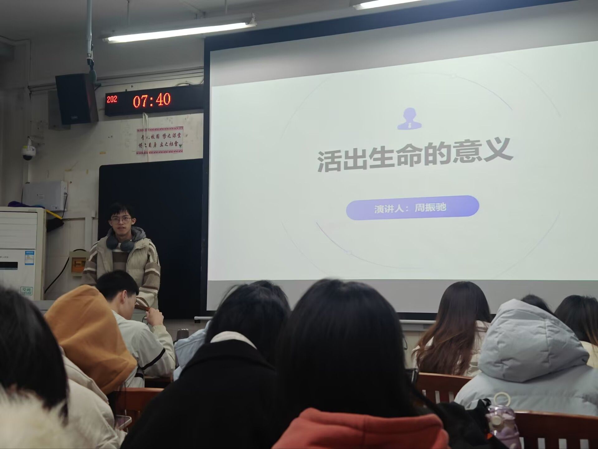 分享伊始,周振驰同学抛出:当我们回首人生的时候,怎样才能毫无遗憾地说,我真正活出了生命的意义?通过这一问题引出《活出生命的意义》一书。书中讲述是维克多·弗兰克尔通过回忆和分析他在纳粹集中营中的见闻和经历,向读者展示人类所面临的极端环境下,是如何找到生命的意义。维克多·弗兰克尔认为,即使在绝望的情况下,个体仍然拥有自由选择的权力,可以选择自己的态度和反应以及个体如何超越困境,找到共存的意义。周振驰同学还向同学们讲述了一位身患重病却依然执着投身公益事业的志愿者的故事。这位志愿者,尽管身体饱受病痛折磨,但他的眼神中始终闪烁着坚定的光芒。他用自己有限的时间和精力,不辞辛劳地奔走于各个需要帮助的角落,为无数身处困境的人们带去了生活的希望和心灵的温暖。