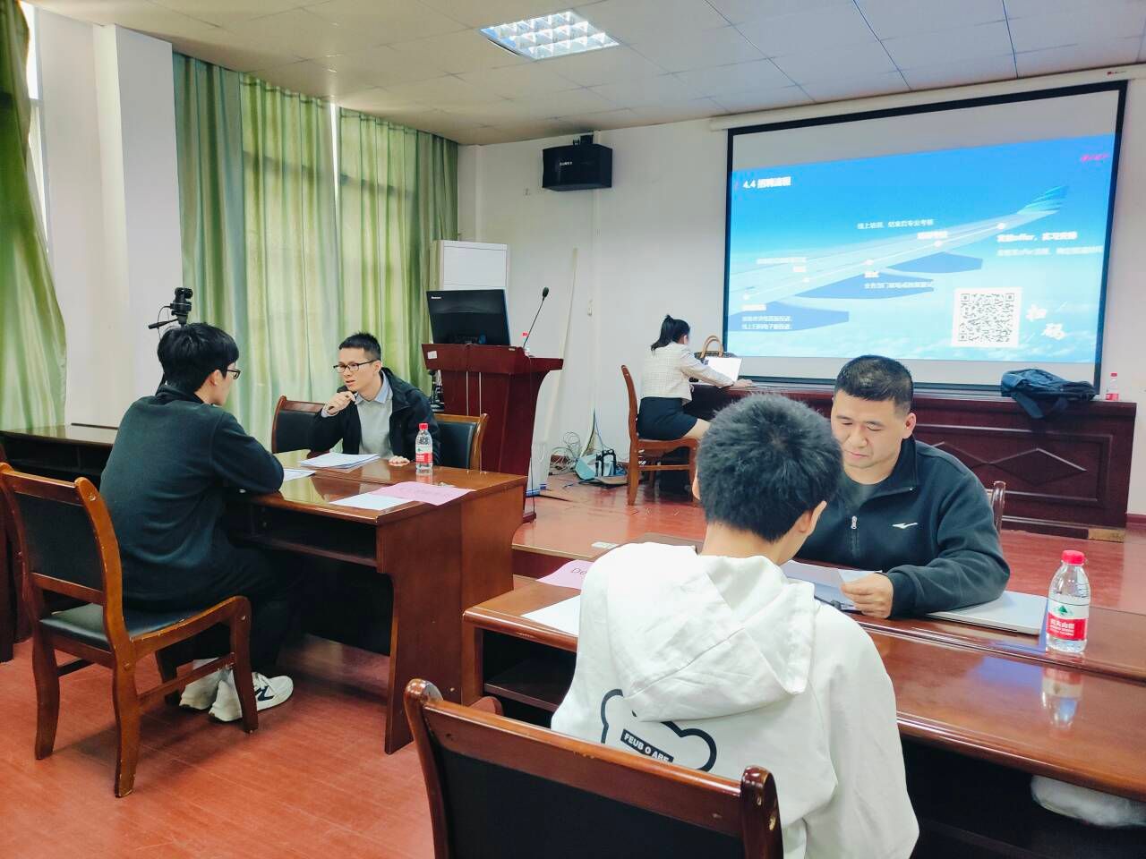 潘桂珍经理就公司的发展历程、润建AI业务布局、企业文化、人才培养及招聘需求等进行介绍,并通过视频展示让同学们对润建股份有限公司有了更直观的了解。宣讲过程中,同学们积极提问,就工作职责、职业发展等问题进行详细咨询。随后,公司负责人对投递简历的同学进行了初面。同学们有序排队,自信地向面试官展示自己的专业知识、实践经验和综合素质。面试官们则对员工的个人情况和应聘岗位,进行深入细致的考察,并耐心解答同学们的疑问。