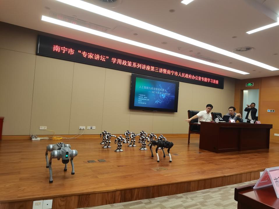 3月27日下午,公司党委常委、副董事长高兴宇带队参加南宁市“专家讲坛”学用政策系列讲座第三讲暨南宁市人民政府办公室专题学习讲座,公司李承云老师带领“智行先锋队”在南宁市“专家讲坛”讲座中机器人舞蹈展示。