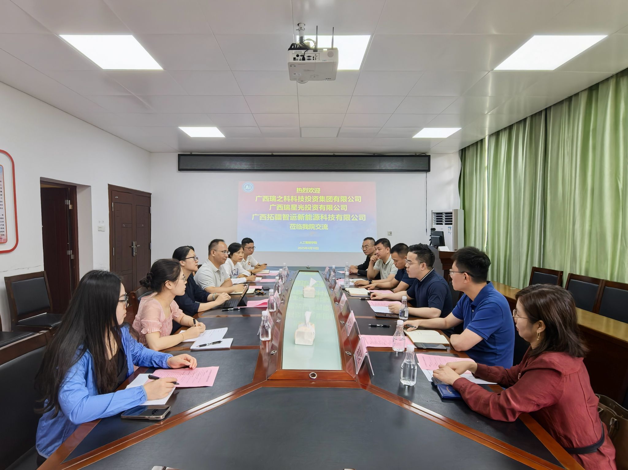 4月18日上午,广西瑞之科科技投资集团有限公司、广西瑞星光投资有限公司、广西拓疆智运新能源科技有限公司的负责人等一行六人到公司博达楼405室开展校企合作洽谈会。公司党委书记刘志雄、党委副书记潘彦燕以及教师代表参会。