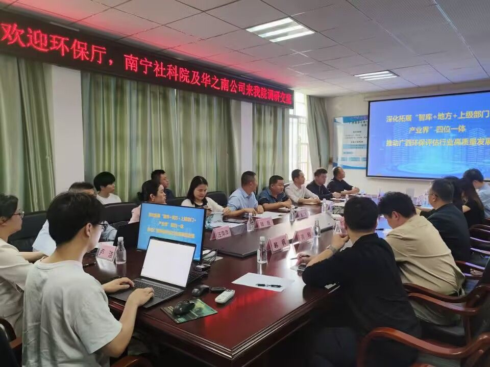 自治区环境保护宣传教育中心主任覃文用指出,当前环保工作面临着诸多挑战,亟需借助人工智能等先进技术提升治理效能。南宁市社会科公司东盟所所长周博表示,环保技术改革进展与需求、人才联合培养与资源开放共享等需要校企融合,资源共享,合作共赢。广西华之南环保科技有限公司总经理陆颜详细介绍了环保技术改革进展及“AI+环评”应用场景需求。公司经理葛丽娜介绍了公司在产学研合作、智库建设以及人工智能技术在环保领域的前沿研究成果。双方围绕“AI+环保”技术落地、人才联合培养、智库合作、课题研究合作等议题开展交流讨论,并初步达成合作共识。葛经理指出,公司致力于通过技术创新,为环保行业提供更高效、更精准的方案。
