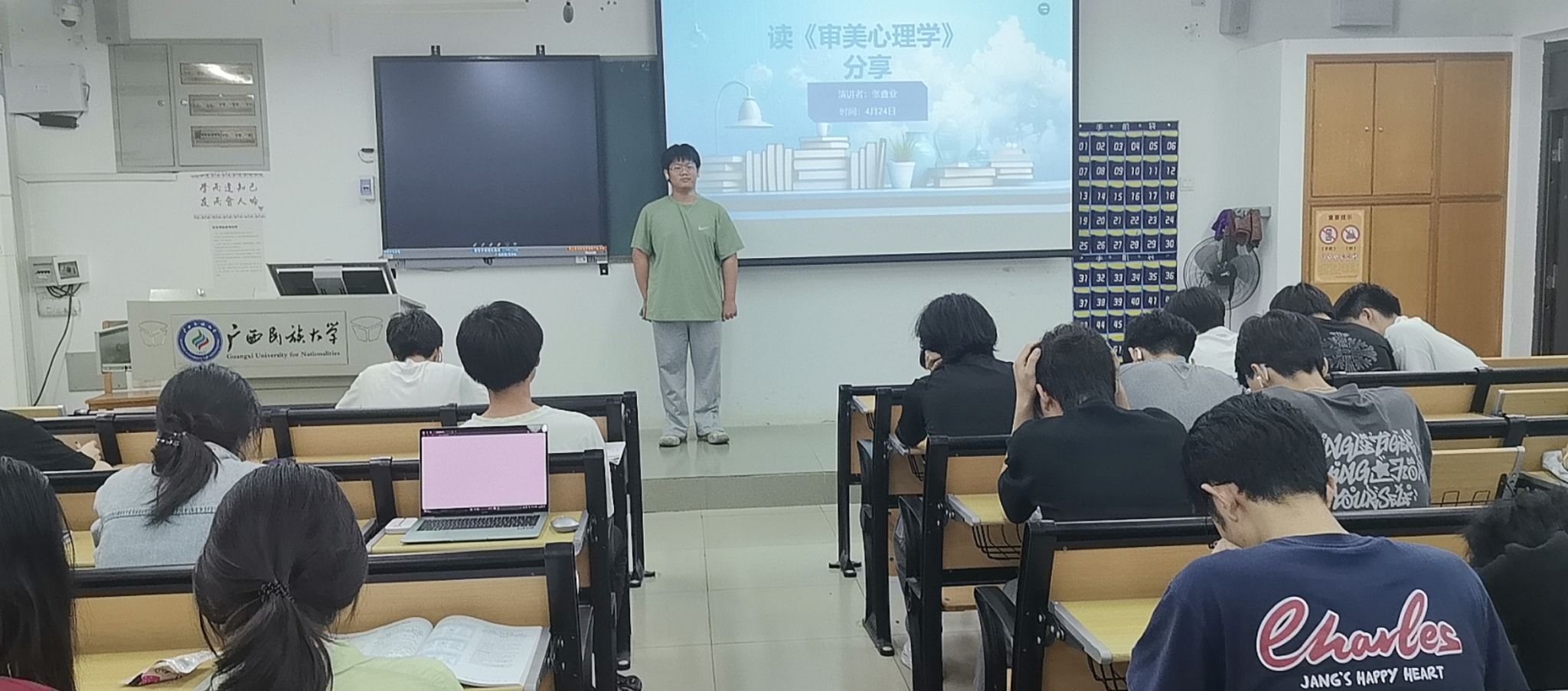 2024级人工智能2班张鑫业同学带来的是《审美心理学》一书的分享。这本书从科学与艺术的角度,揭示了审美感知、情感、想象和理解的奥秘。他以欣赏莫奈的《睡莲》为例,阐述了审美感知中感官与外界物象的协作过程;通过中国山水画,展现了审美情感与文化、个人经历的紧密联系。他表示,阅读这本书能拓宽美学认知边界,希望同学们借此探索人类精神世界,感受美的力量。