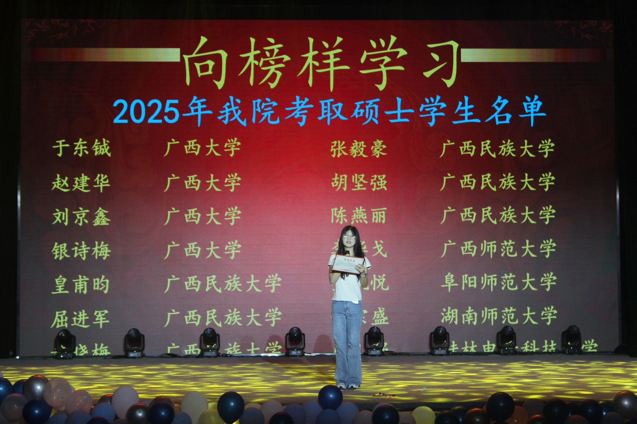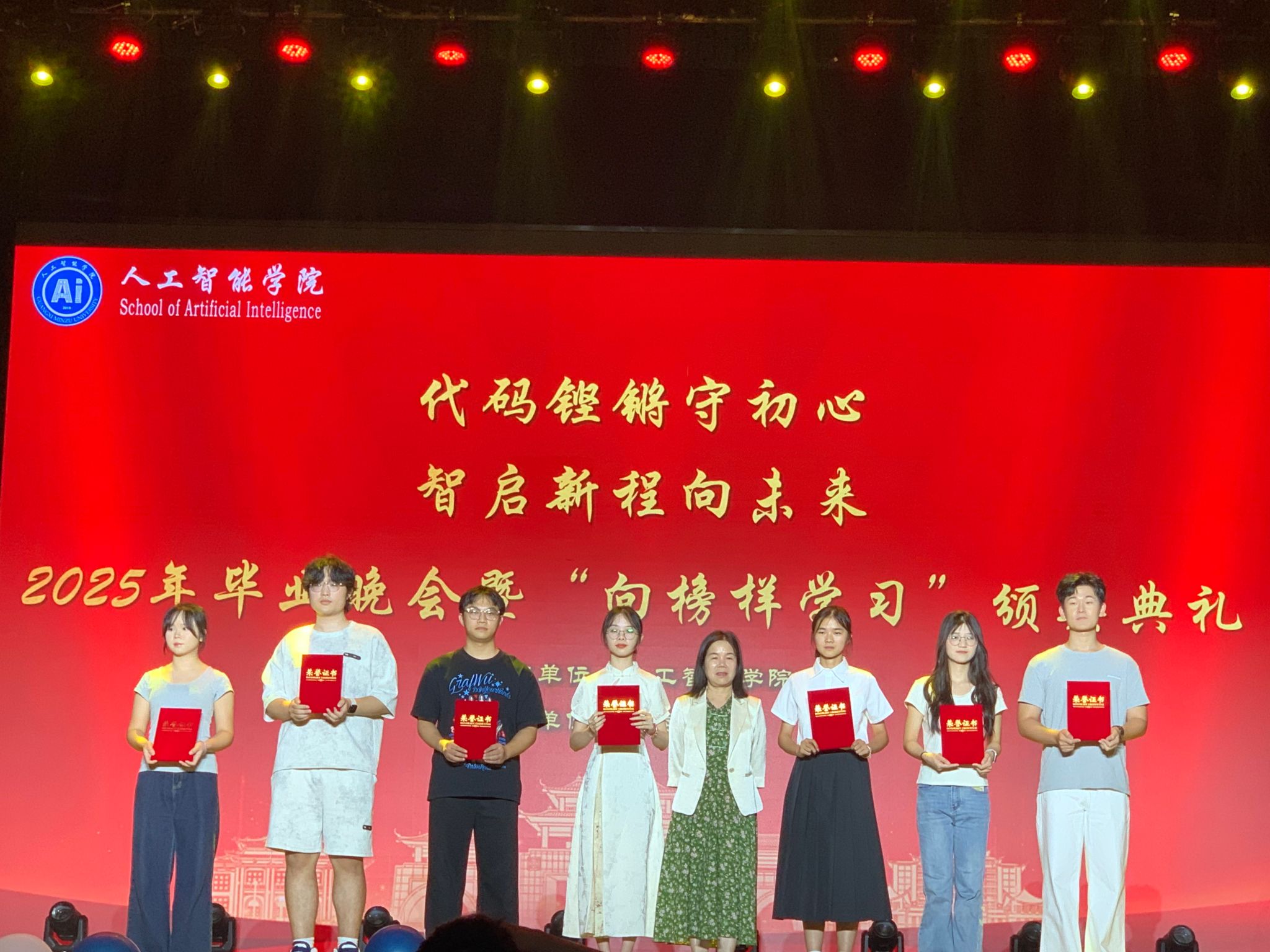 在精彩的节目表演间隙,“向榜样学习”颁奖环节成为了晚会的又一亮点。主持人依次宣读优秀学子名单,公司领导为他们颁发荣誉证书。这些优秀学子在学业、专业竞赛、员工干部工作等各个领域表现突出,用实际行动为学弟学妹们树立了优秀的榜样,他们的成就也激励着在场的每一位同学努力奋进。
