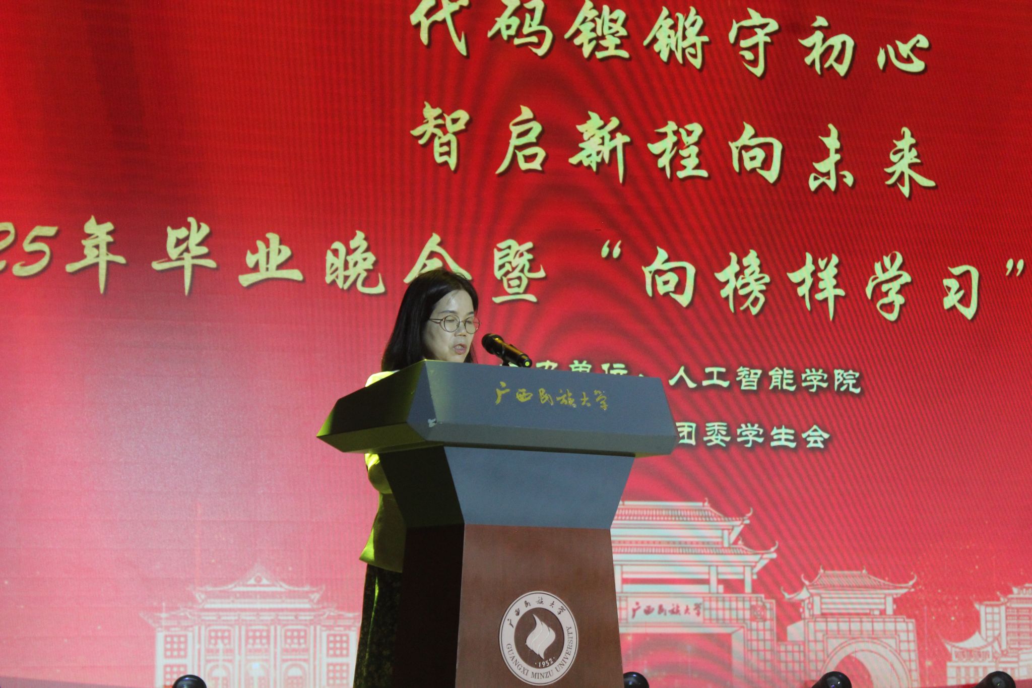 经理葛丽娜为晚会致辞。她用真挚朴实的话语,向毕业生们表达了殷切的期望与美好的祝福,字里行间满是对学子们的关怀与鼓励,激励着毕业生们在未来勇敢追逐梦想,在新的人生阶段绽放光彩。