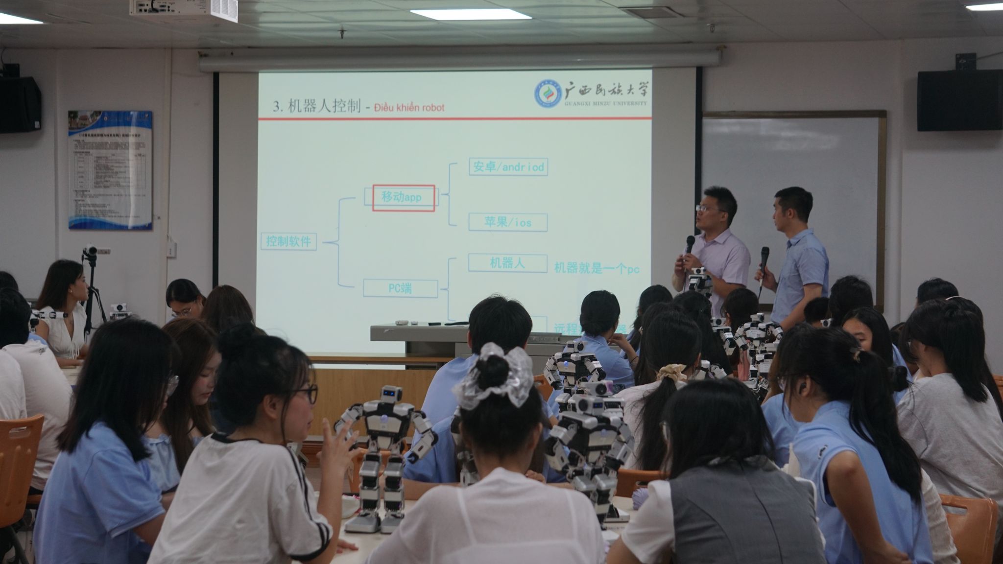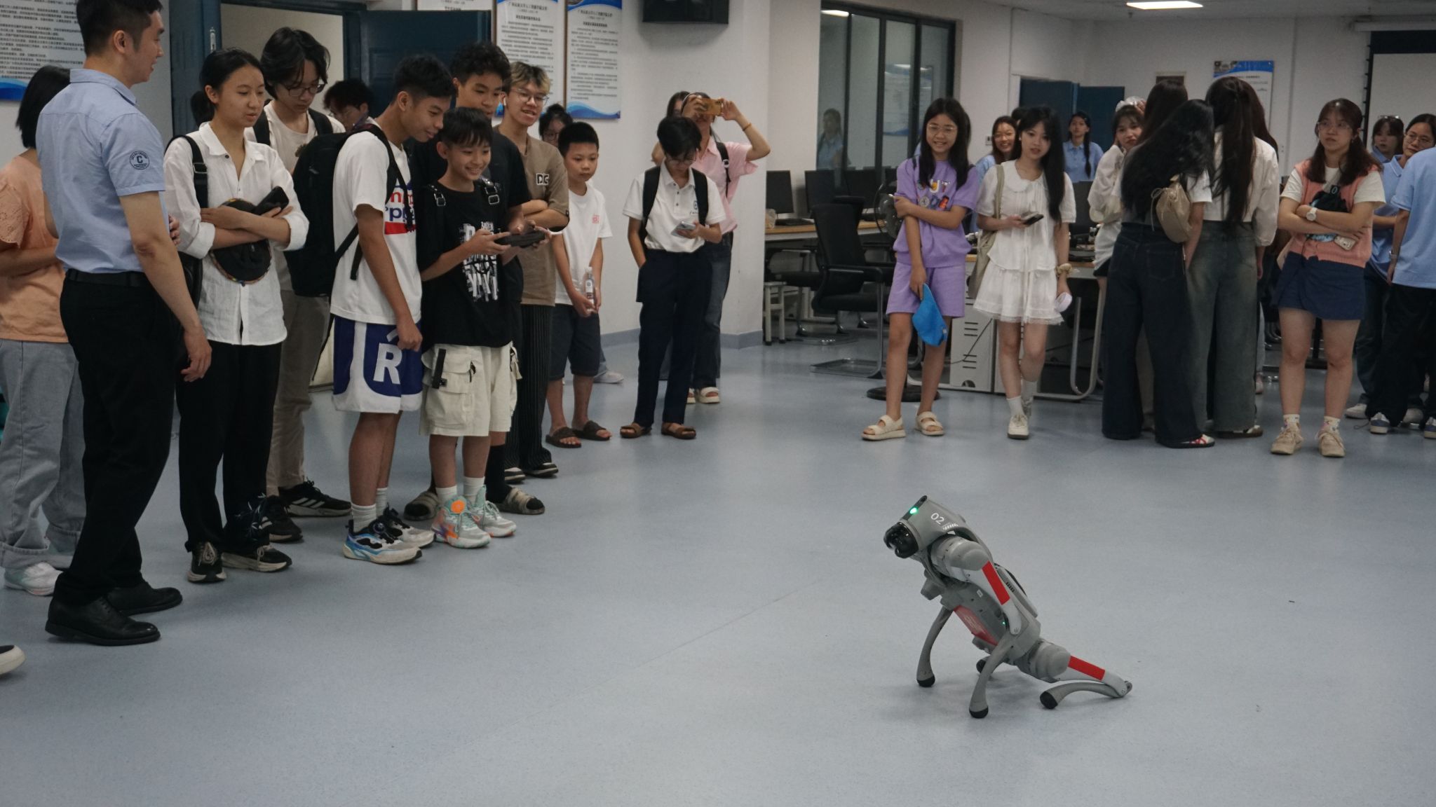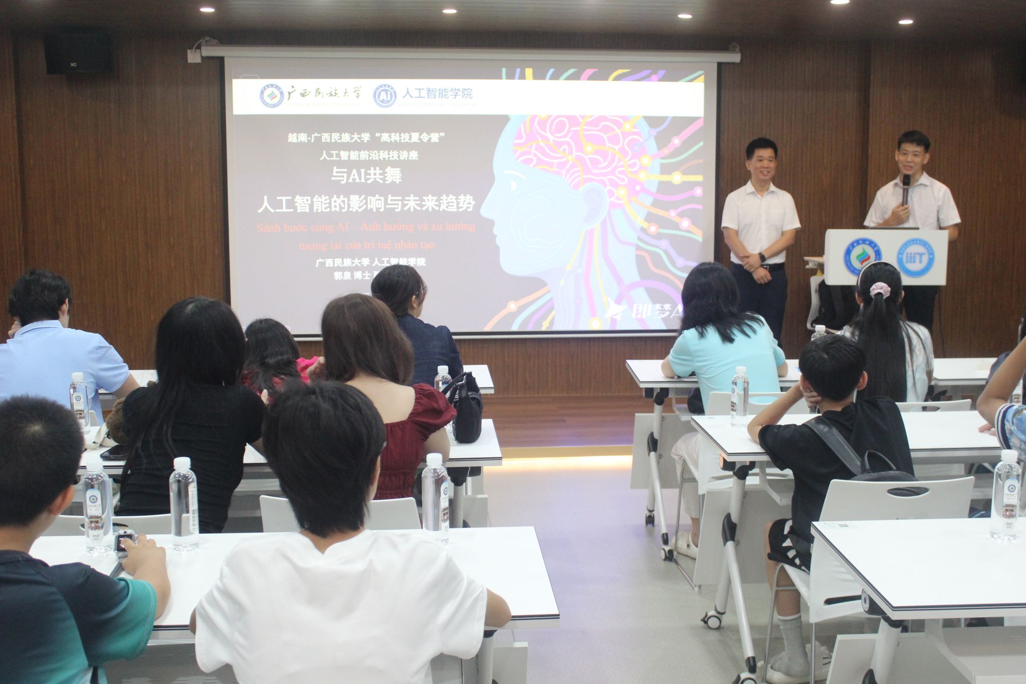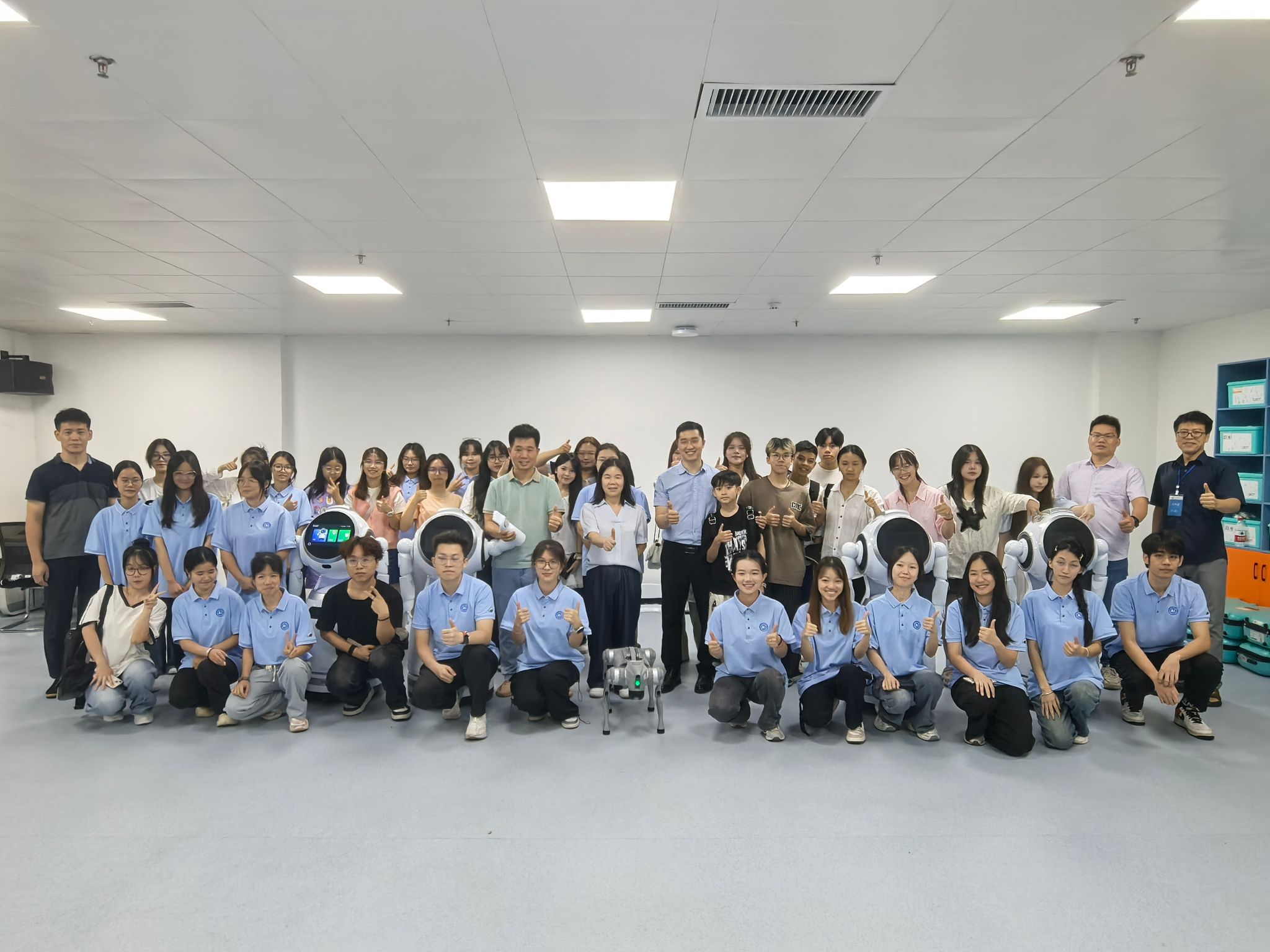 6月22日,公司教师郭泉博士率先带来《人工智能的影响与未来趋势》前沿科技讲座,以生动案例与详实数据,深入浅出地剖析人工智能发展脉络,引得越南青年代表频频提问,现场互动热烈。黄华娟等10位教师与中越青年围坐一堂,开展圆桌交流会。6月24日,李承云博士负责的“人形机器人结构分析与舞蹈控制”团队实践项目,将活动推向高潮。中越青年共同参观体验了机器人、机器狗等前沿人工智能产品,亲手操作、亲眼见证科技的神奇,惊叹声与欢笑声此起彼伏。
