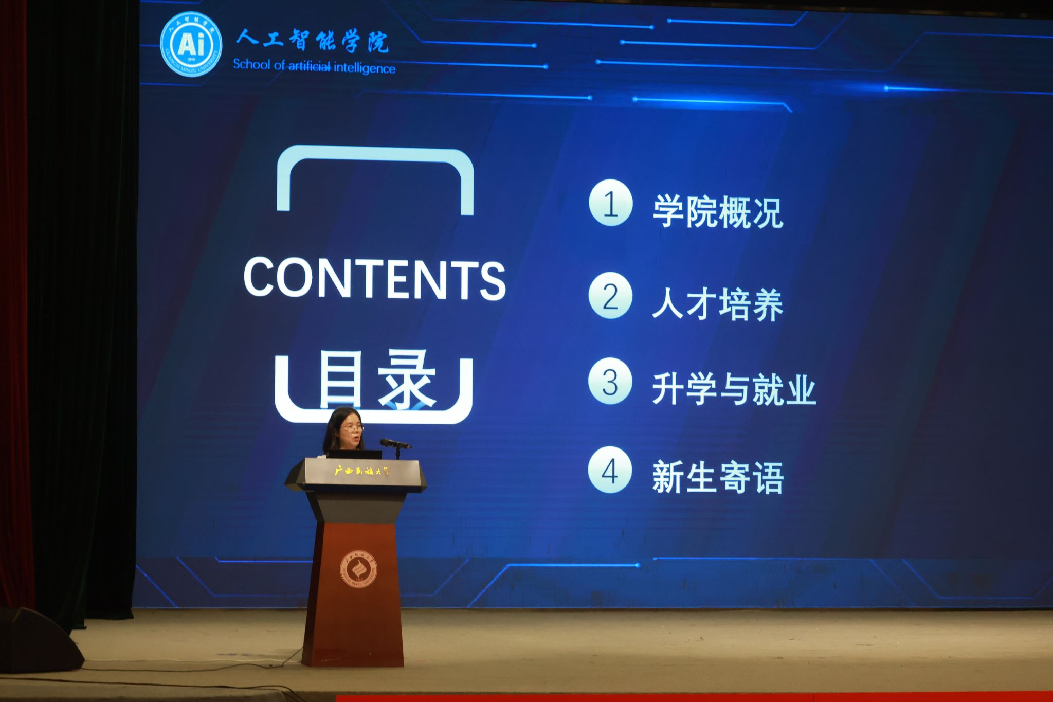 黄华娟老师作为教师代表发言,她对2025级新生表示热烈欢迎,并对同学们未来的学习生活提出三点希望:一是深耕专业筑牢根基,以扎实学识应对人工智能领域的技术变革;二是勇于探索敢于创新,在实践中突破思维局限、锤炼专业能力;三是涵养品格坚守初心,用科技力量践行社会责任,成长为德才兼备的新时代AI领域学习者。