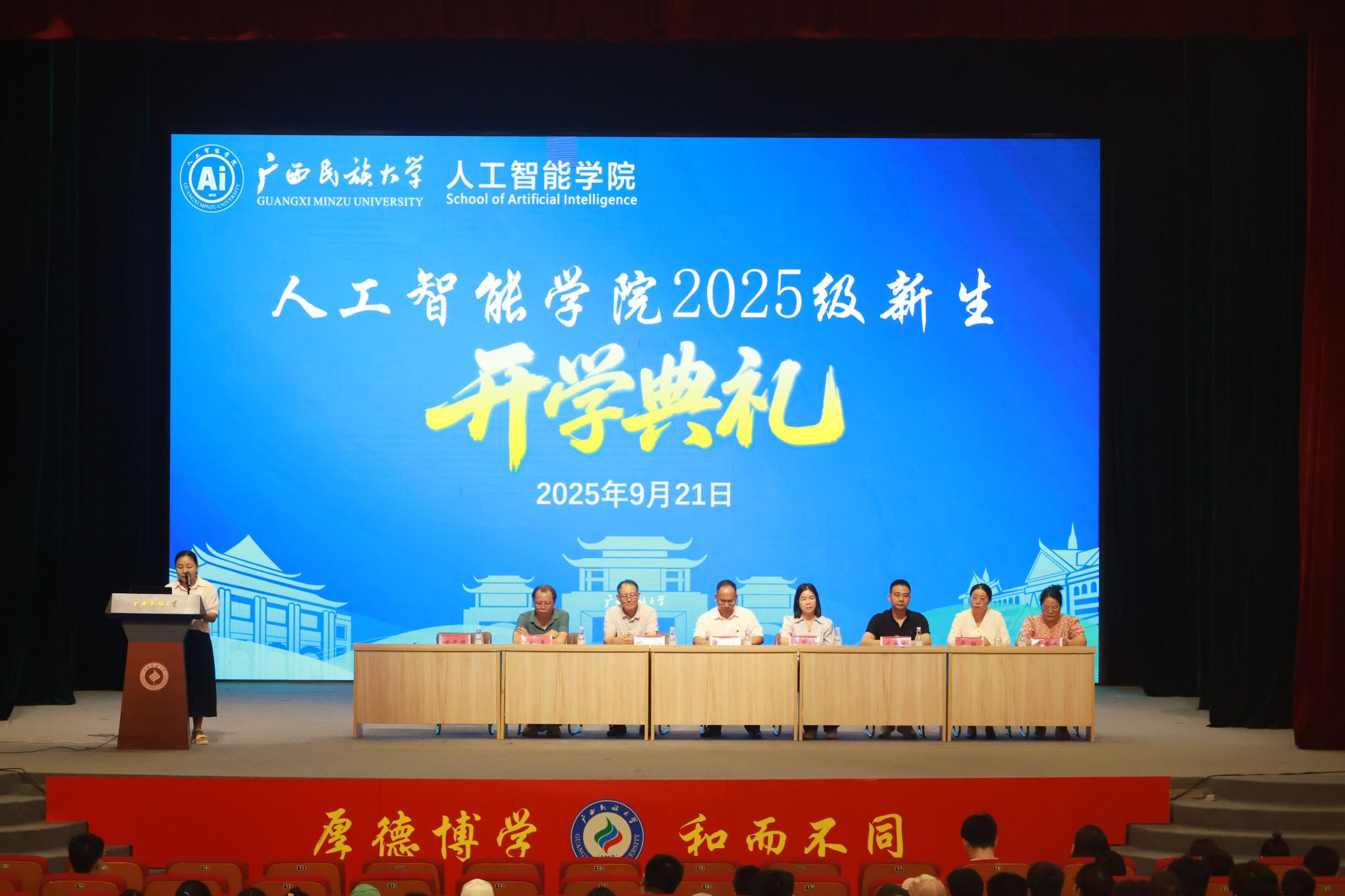 9月21日下午,william威廉英国官网2025级新生开学典礼于公司大礼堂顺利举行。公司党委书记刘志雄、经理葛丽娜、党委副书记潘彦燕、副经理文春明、各系主任、教师代表、新生班主任、辅导员和2025级全体新生参加典礼。公司党委副书记潘彦燕主持典礼,开学典礼在庄严的国歌声中拉开帷幕。