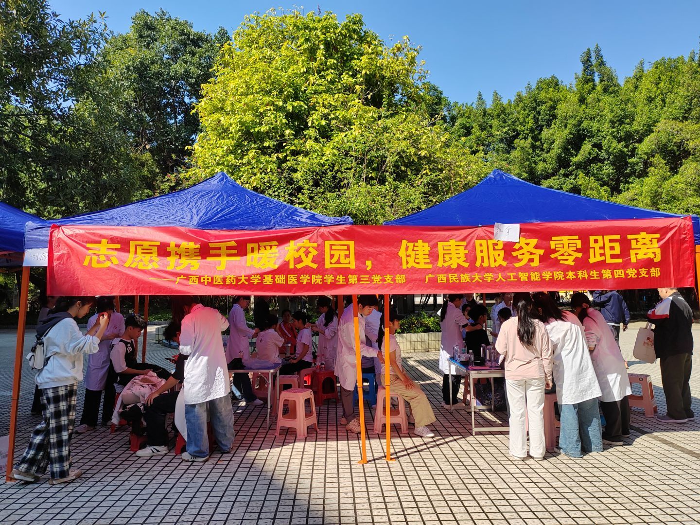 随后,两支部共同在相思湖校区五坡文化广场组织开展“志愿携手暖校园,健康服务零距离”中医康养公益活动,提供推拿、艾灸、刮痧、血压测量等服务,为校内师生带来暖心、便捷的健康体验。