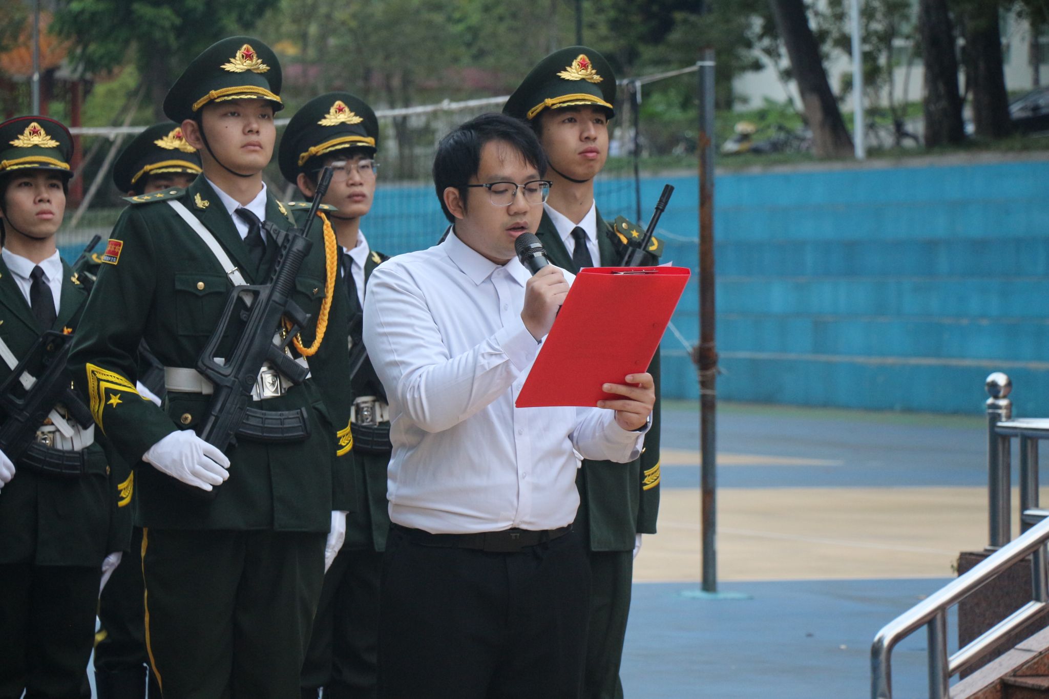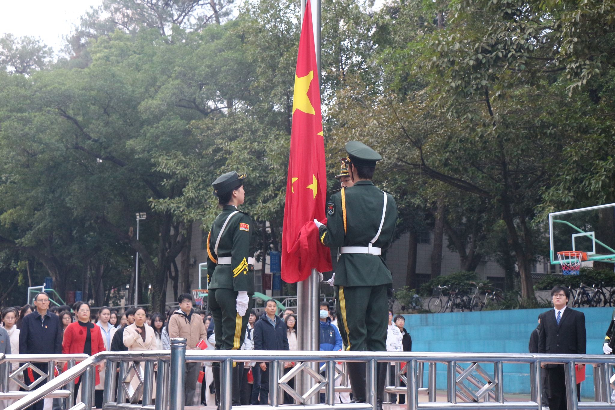 清晨的灯光球场秩序井然,师生着装整齐,静候仪式开始。伴随着《义勇军进行曲》奏响,护旗手迈着铿锵有力的步伐,护送五星红旗走向升旗台。全体师生肃立注目,在激昂的国歌声中,注视着鲜艳的国旗冉冉升起,爱国情怀与自豪感在心中激荡。