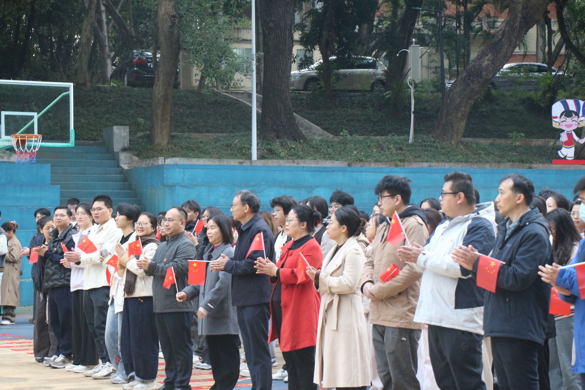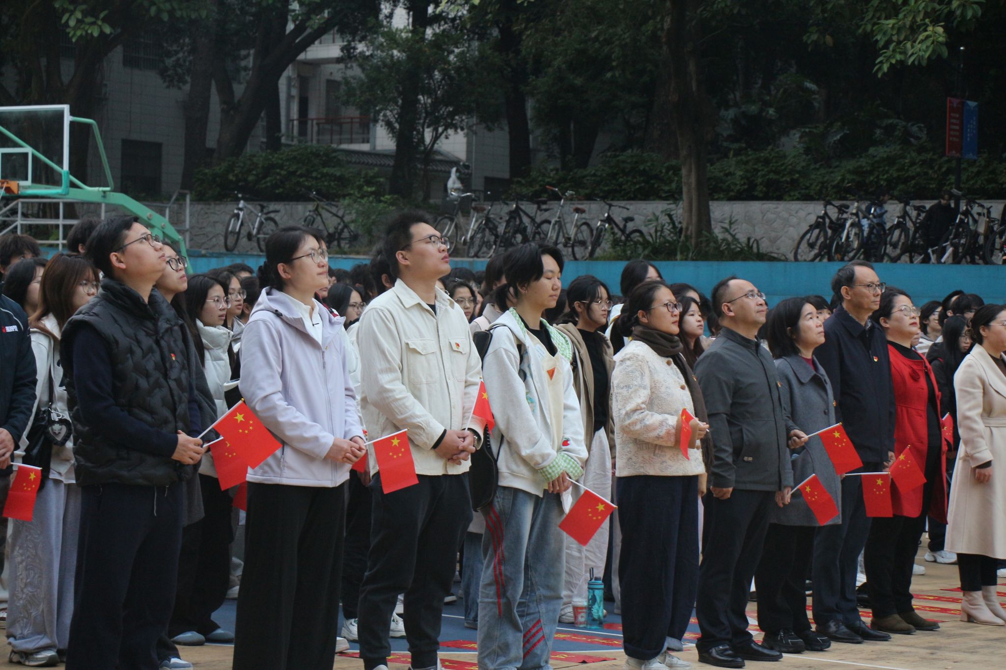 发言结束,全体师生齐声合唱《我和我的祖国》,并挥舞手中的国旗。歌声嘹亮,情感真挚,充分展现了青年学子和教职工深厚的爱国热情与家国情怀。