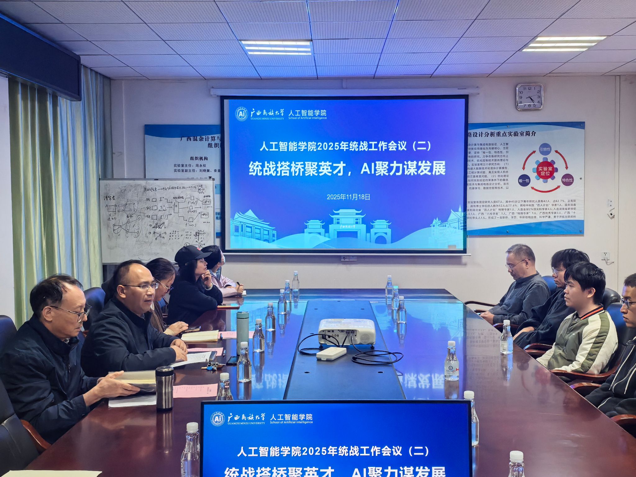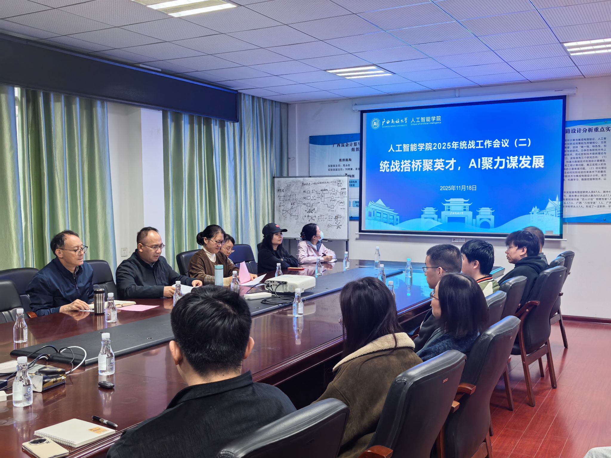 11月18日下午,公司在博达楼503会议室召开2025年第二次统战工作会议。会议以“统战搭桥聚英才,AI聚力谋发展”为主题,由公司党委副书记潘彦燕主持,公司领导班子成员及非中共党员教职工参加。